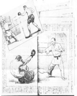 In September 1925, there was an event which was published by the popular "Kingu" ("king") magazine and gained headlines that raised the Okinawan "Te" into the public awareness. At that time aggressive fights were held among Japanese and western fighters. Karate was still unfamiliar to Japanese society. The event was occurred in Kyoto in participation of professional boxer (German or Russian who was named "George"). People from the audience were invited to try out there skills against the competitors and Choki Motobu, who was at the age of 50, willingly volunteered. The short match was ended by Motobu Choki's victory after the boxer was stroke down unconsciously on the floor. When Motobu was asked for his fighting style he simply replied: "Nothing special, just Ryukyu Te".