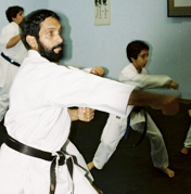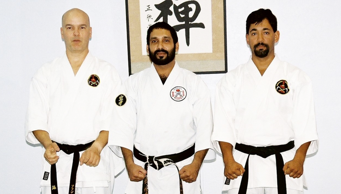 Sensei Francisco Santander (S.K.K.A.F.), Sensei Ali Mohammed (O.K.K.C.-U.A.E.), and Sensei Rafael Tovar (O.M.A.A.) during a training session at the Okinawa Martial Arts Academy dojo - Summer 2007